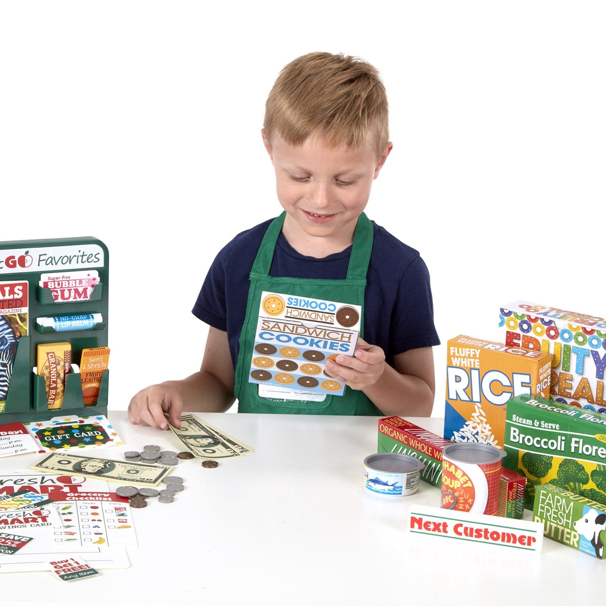 This companion set to the Fresh Mart Grocery Store has everything kids three and older need to stock shelves and get shopping! There are 70 pieces to play with, including grocer and shopper role-play items like an apron, conveyor belt divider bar, and