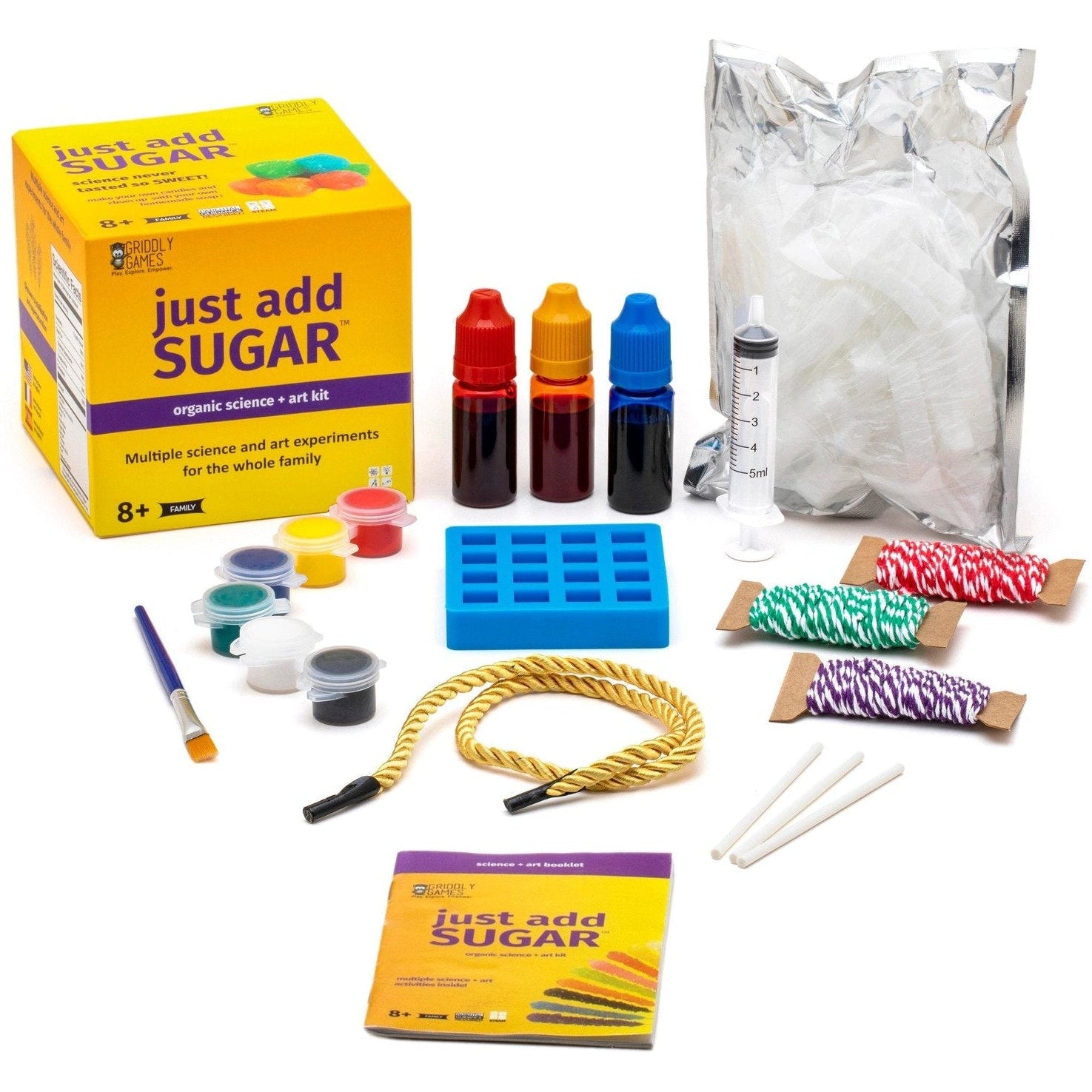 Just Add Sugar makes science and art at home easy by using supplies you already have. This kit comes loaded with everything you need for at-home science and art experiments, all you need to do is add the missing ingredient. ?This bio-organic STEAM kit will sweeten the interests of artists and scientists alike! More than 15 science and art activities like making your own candy, sugar cubes, and then clean up with your own homemade soap. Discover chemical reactions, supersaturation, and crystallization. This kit features instructions in English, Spanish and French. Designed for kids ages 8 and up.