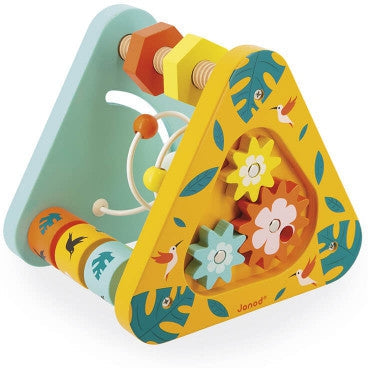 Multi-activity and vibrant triangle! This early learning toy promises many new discoveries for baby. With 7 activities: Maze, mirror, gears to turn, nuts to screw, abacus, rain stick and cylinders to align, this wooden toy is ideal for children from 12 months. Compact, this comprehensive toy is easy to carry around and for the child to handle. Children from the age of 1 will be able to develop their fine motor skills, their coordination and become familiar with colours and shapes! With a multitude of activities on each side, baby will always be discovering new things! This wooden early years toy is made from water-based paint and wood from sustainably managed, FSC®-certified forests.