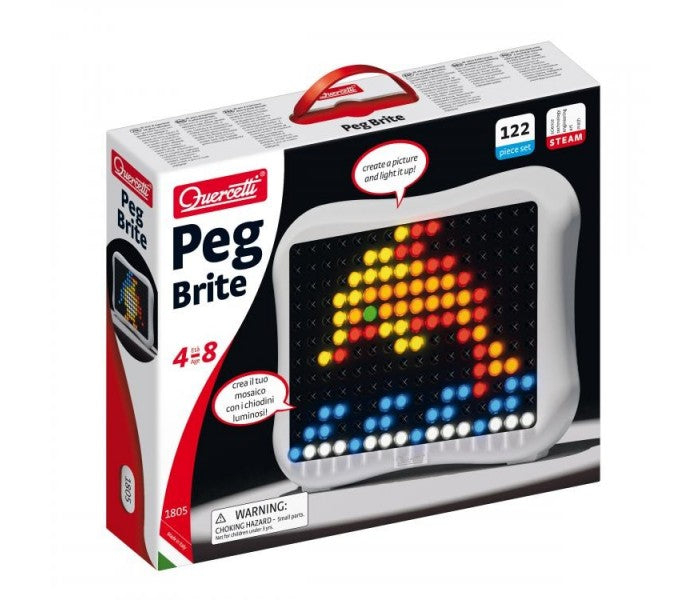Create your bright mosaic with pegs. Peg Brite is a lamp toy to light up a kid’s room in a creative way. It has a nice trendy design, featuring a flat screen and rounded edges. The original and innovative structure of the peg Brite screen lets children create images with pegs with unlimited creative freedom. The toy also comes with an album of 12 sample images. The light is generated by an electronic circuit, and uses latest generation LED lights, which are very bright and use very little power. The pegs are shaped like little lamps which are easy to insert into the perforations on the screen and feel good to the touch. They are made of a crystalline material that sparkle in the light even when peg Brite is turned off. Uses 3 AA batteries (not included).