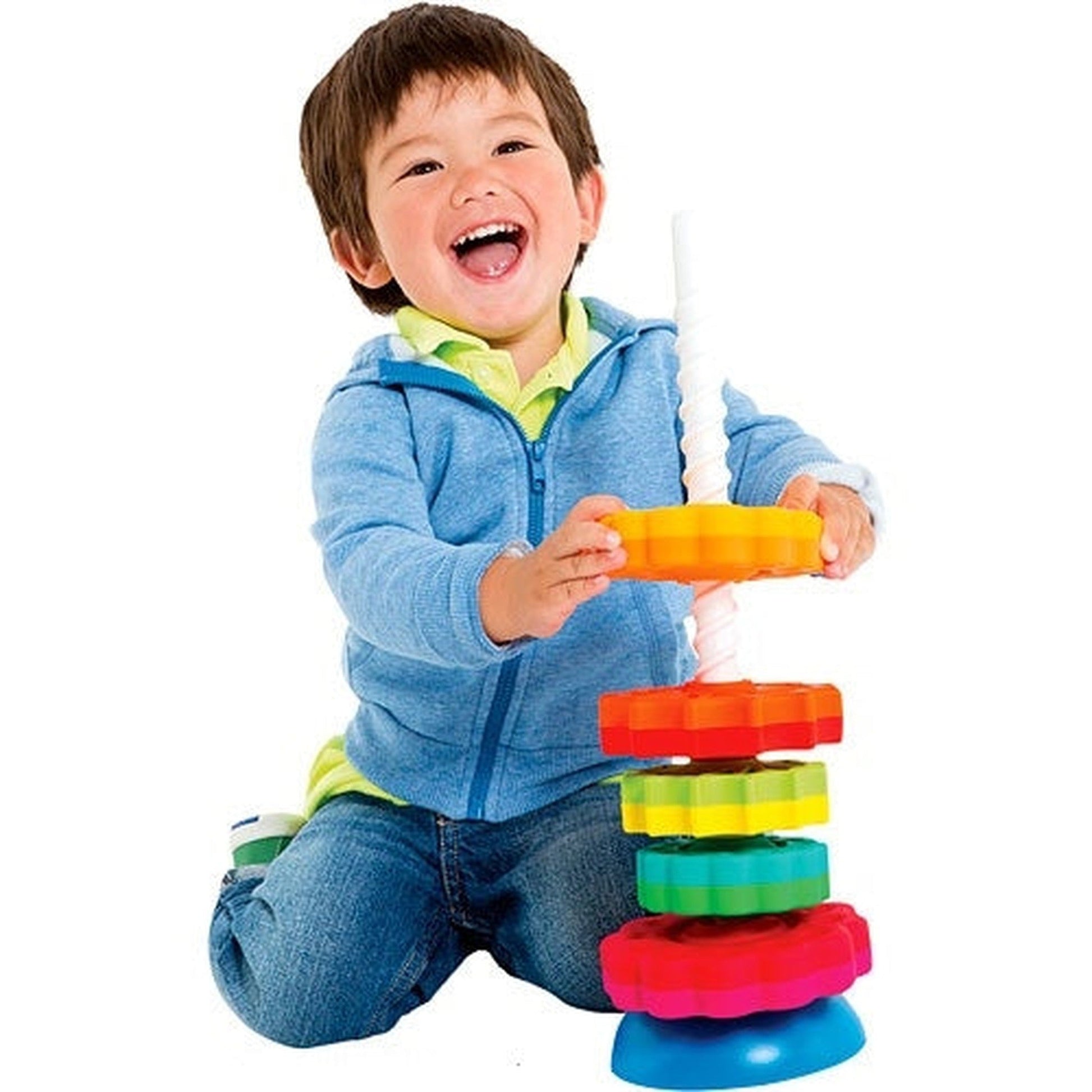 It's a stacking toy with a spin—literally!
